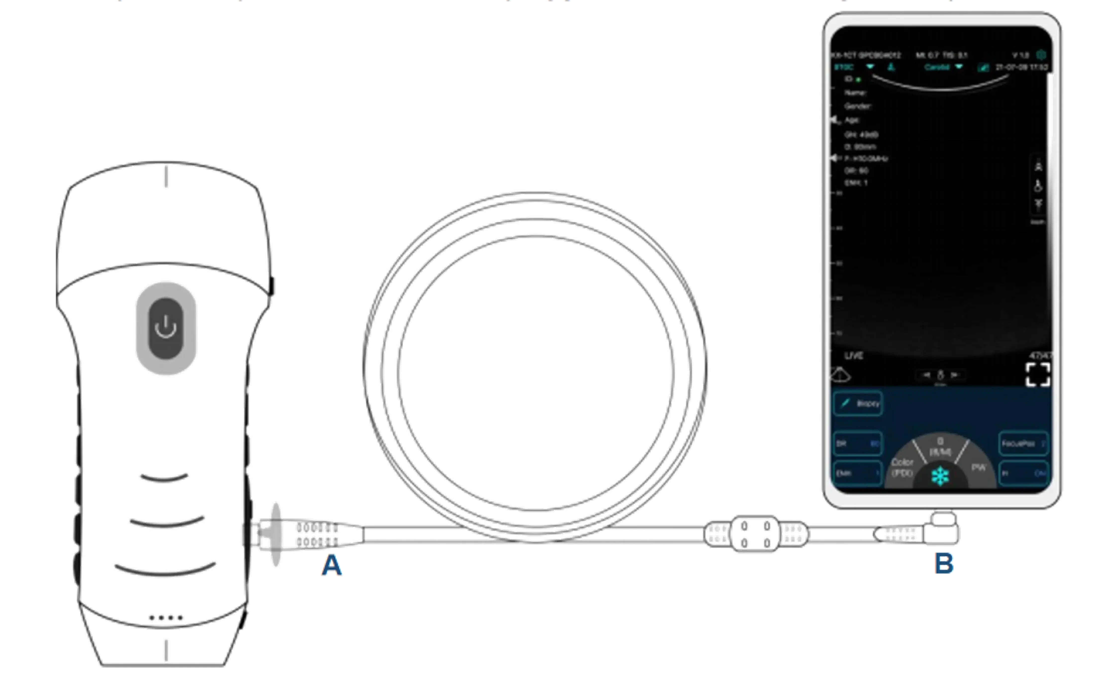 The A-end must be fully inserted into the probe and the B-end must be fully inserted into the smart device