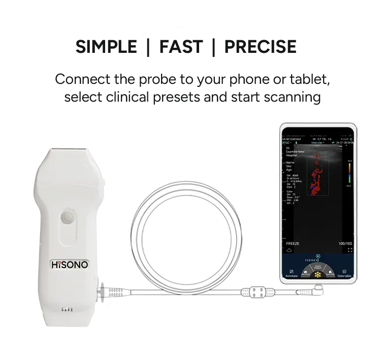 The HiSONO handheld ultrasound device is fully compatible with Windows, iOS, and Android systems, and can be flexibly used with mobile phones, tablets, and computers. They offer stable cross-platform connectivity and convenient, unrestricted operation, meeting diagnostic needs in various scenarios.