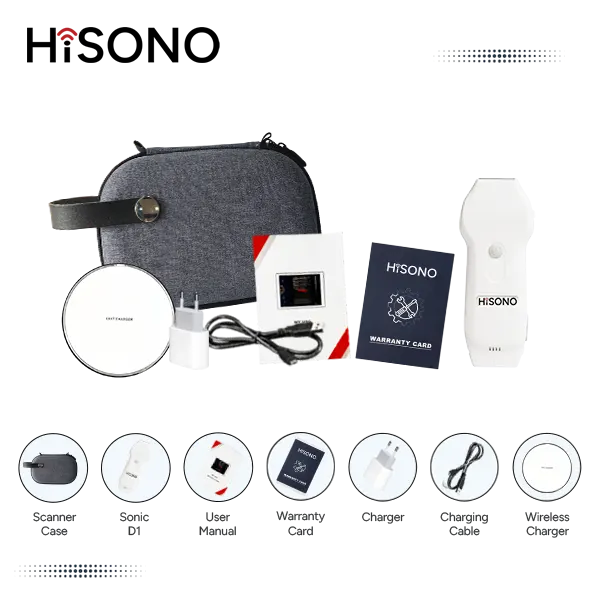 Purchase the HiSONO Sonic D1 portable usg machine and enjoy free access to 6 display modes, 16 presets, and 10 body markers for enhanced convenience during your examinations. The following are the items that come with your pocket ultrasound: