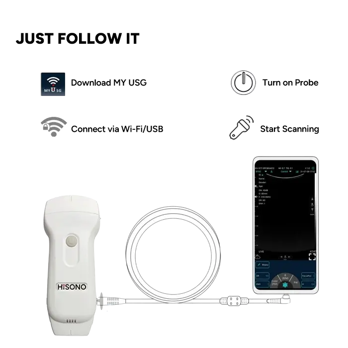 - Connect the Device: Power on the device and connect the ultrasound probe via Wi-Fi or USB, following the instructions in the Quick Guide.